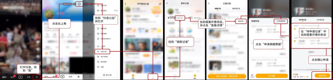 您可通过【抖音】-点击【我】-右上角【三】-【抖音公益】-右下角【我的】-左上角【捐款记录】-滑动到对应的公益项目-点击【查看详情】-点击【申请捐赠票据】,提交信息后进行票据申请。您可以申请开具当年(自然年)内,所有未开票捐赠的对应票据。