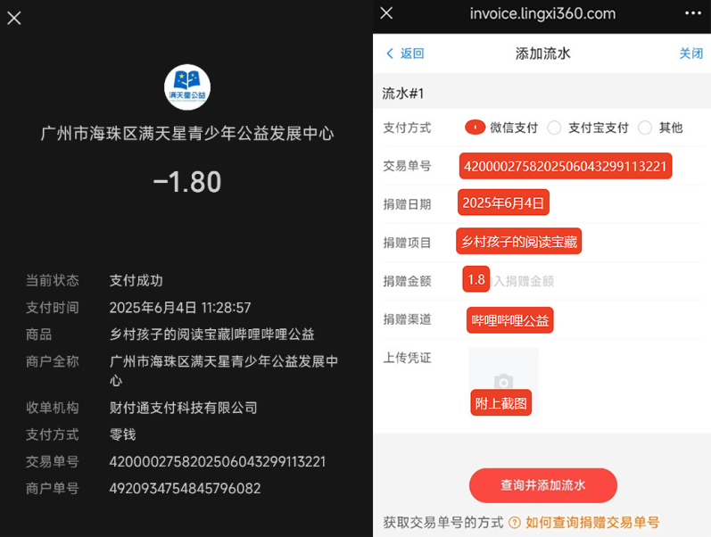由于哔哩哔哩公益无票务系统,需要在所示界面附上捐赠成功的付款截图,并将其填写到对应的栏目内申请票据。下图示例为通过微信捐赠的流水。