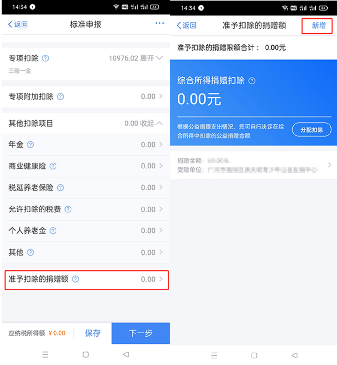 ③滑到最底端选择“准予扣除的捐赠额”,进入后点击右上角“新增”。