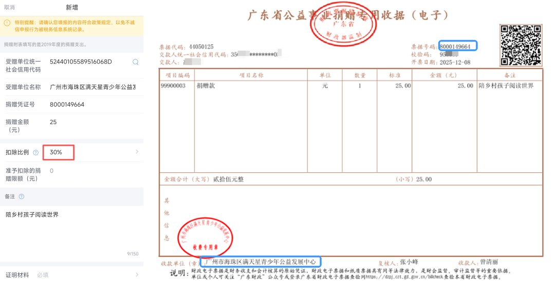 ④根据你提前获得的捐赠收据,注意看左下角的收款单位(即受赠单位),据实填写其统一社会信用代码、受赠单位名称、捐赠凭证号(即票据号码)、捐赠金额。