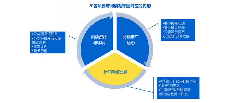 满天星公益以阅读循环圈理论为基础,结合多年的项目实践,创建了满天星公益乡村儿童阅读推广体系。该体系主要围绕提供阅读资源、打造阅读环境、组织阅读活动和培养有阅读协作能力的教师开展服务。