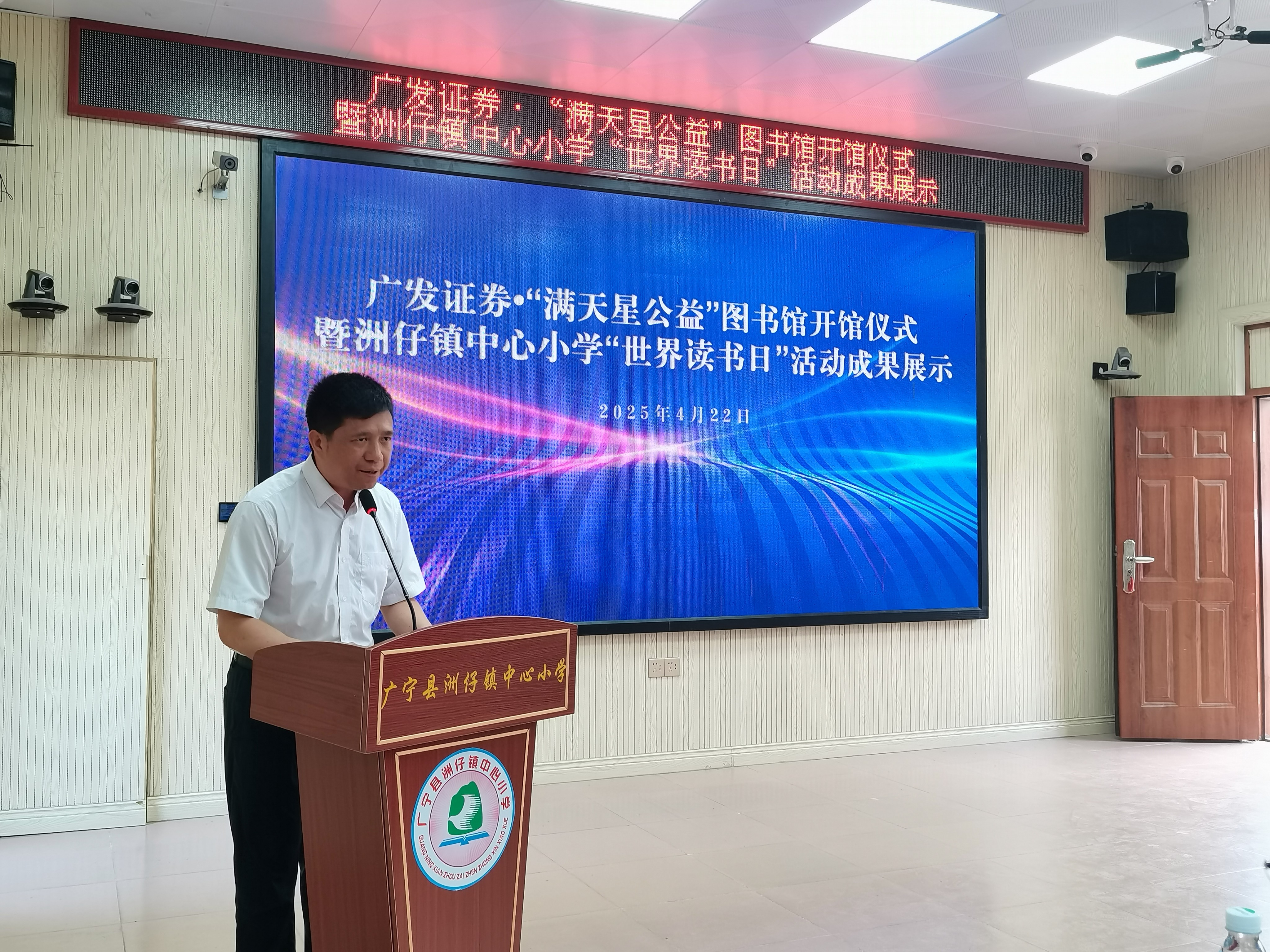 广宁县委副书记鲁言波指出了图书馆作为知识传播、智慧启迪及学生成长中角色的重要性。对此,他鼓励学生充分利用这一资源,通过阅读拓宽视野,丰富知识。同时,他期望借此机会加强学校的阅读教育,营造良好的阅读氛围。对于广发证券的捐助和满天星公益的辛勤付出,他也表达了深切的感激,寄望图书馆能成为孩子们探索知识的殿堂,为社会培养更多优秀人才。