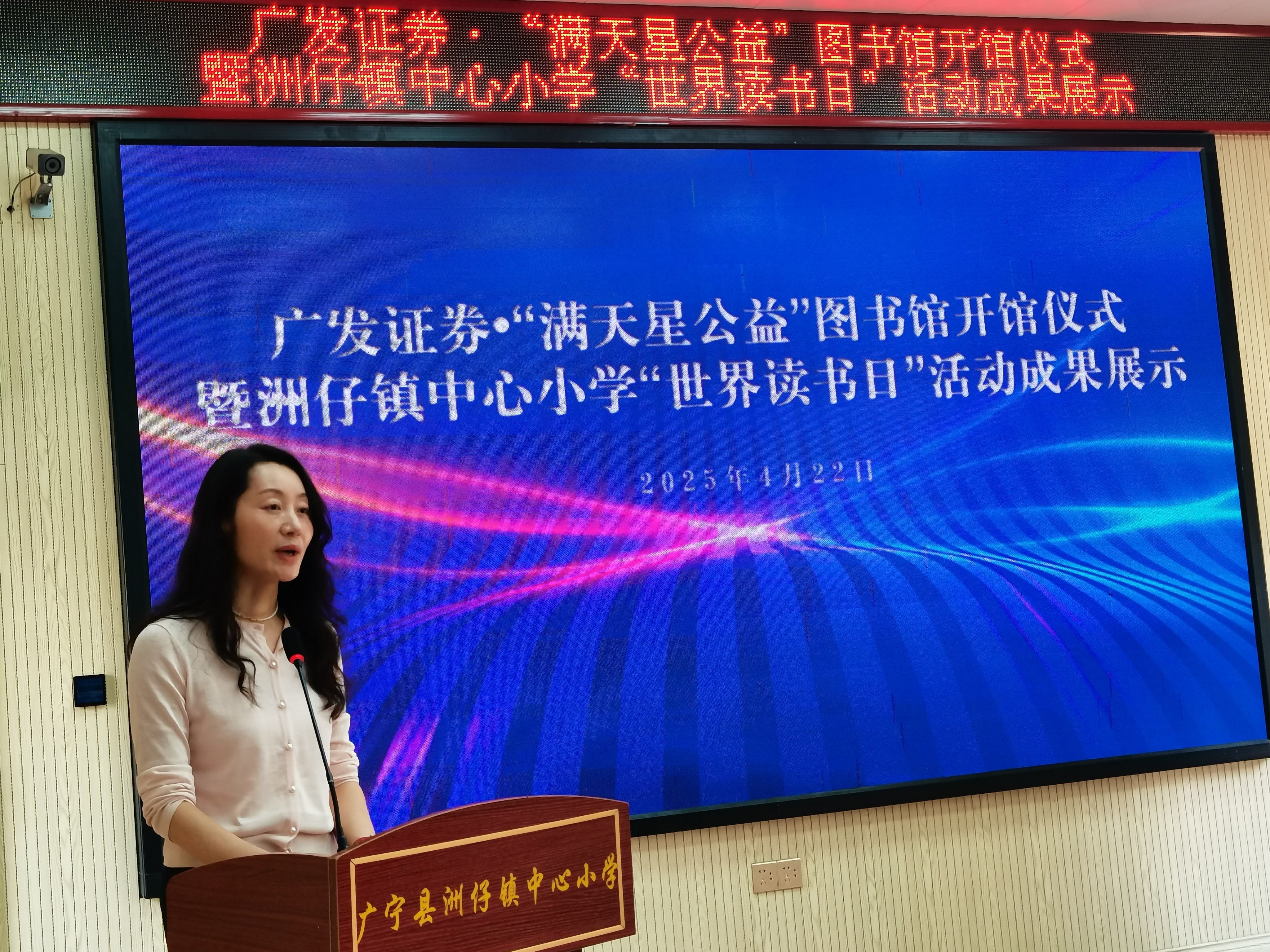在广发证券捐赠并于满天星公益合作建立的第7所乡村小学图书馆在广宁县正式开馆的仪式上,广发证券党群工作部总经理王欢对参与筹备的各方表达了感谢。她回顾了与广东省生态环境厅、广东农工商职业技术学院合作,共同助力广宁县周仔镇乡村教育发展的情况。她也强调了知识改变命运的理念,并承诺广发证券将持续用专业态度参与公益,为乡村儿童创造更美好的未来。