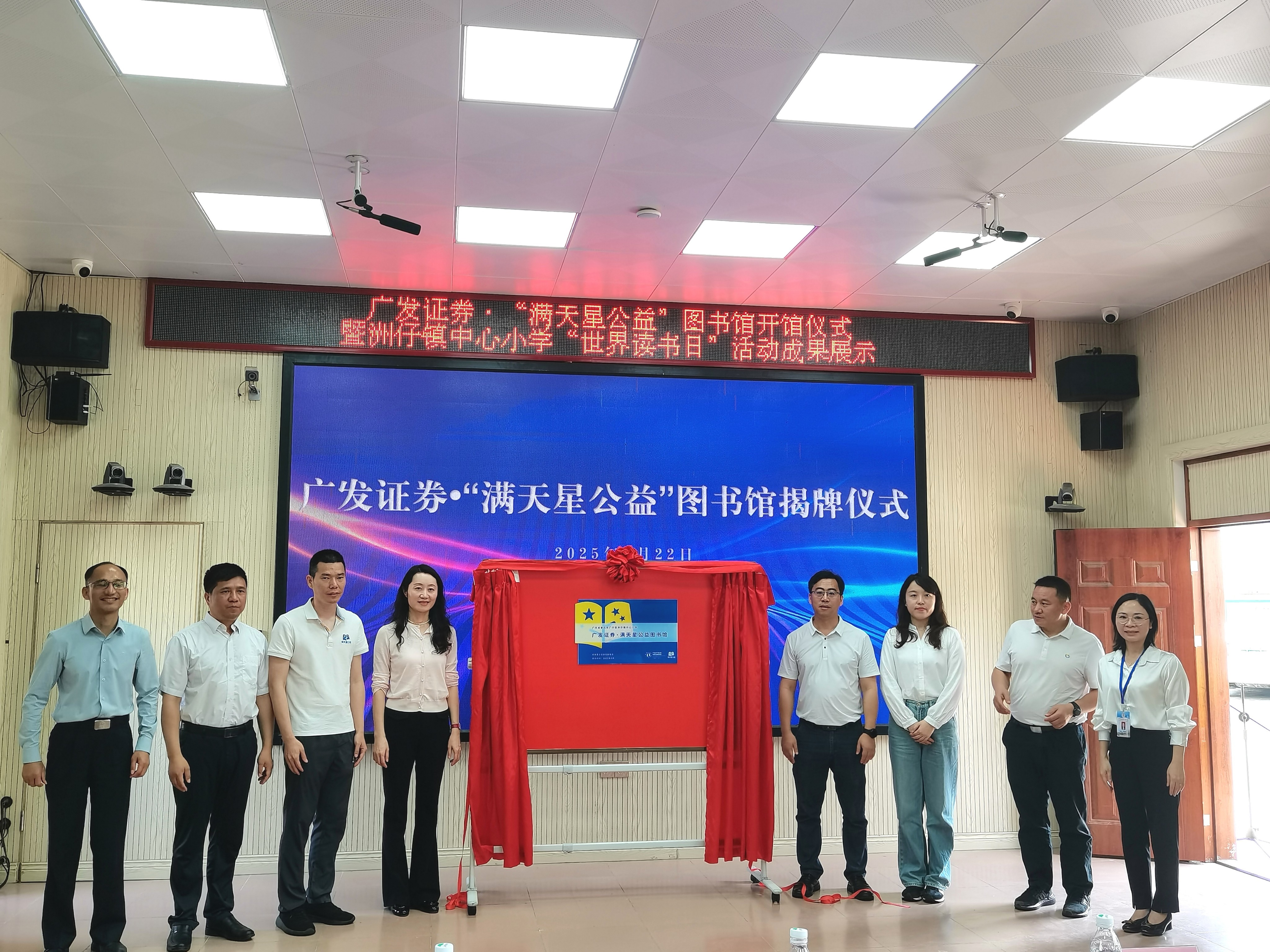 开馆仪式的最后,由各方代表一同为广发证券·洲仔镇中心小学·满天星公益图书馆正式揭牌,正式宣告图书馆的开放使用自此开始。