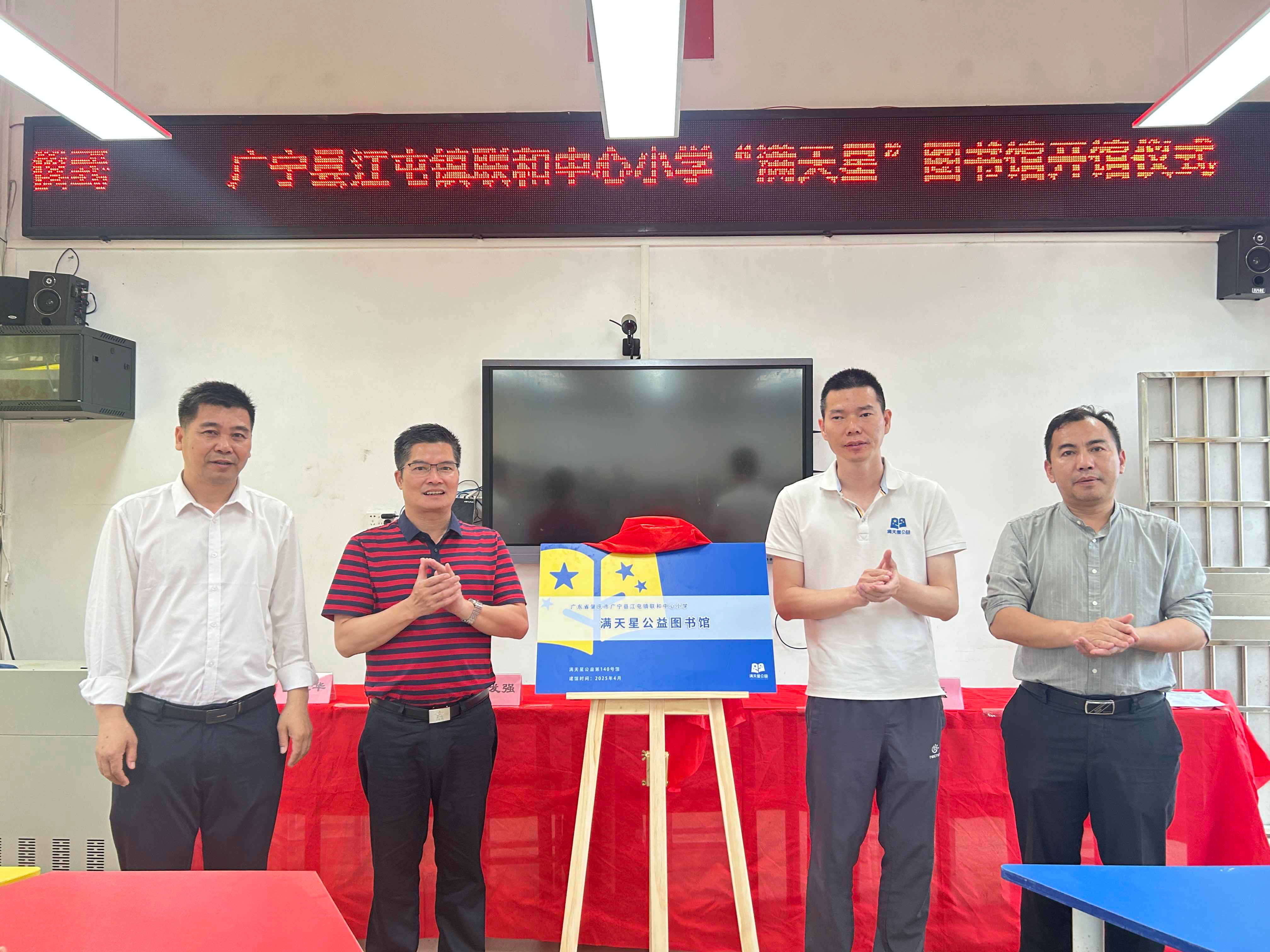 在第30个世界读书日的上午,这个儿童友好的、有着明亮蓝黄配色的阅读空间正式向全校师生敞开大门,江屯镇联和小学·满天星公益图书馆迎来了它的开馆仪式。江屯镇人大副主席李坪、广宁县教师发展中心代表、满天星公益创始人梁海光、江屯镇中心小学校长张玉华、江屯镇中心小学副校长谢树林共同出席了本次活动。