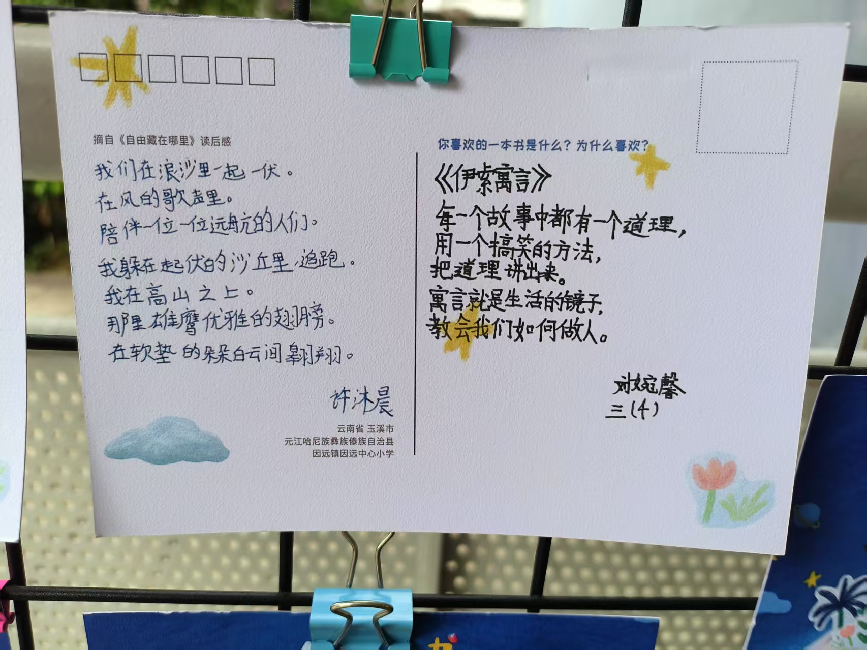 4月21日,时代玫瑰园小学便在校园里提前展出了童书乐捐计划项目点学校的孩子所写的读后感明信片,鼓励学生们也一同写下自己在阅读过程中收获的感想。
