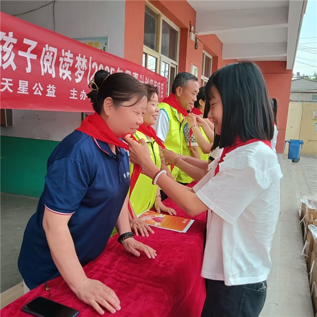 在派发仪式上,爱心人士及校长将星囊包逐一发放到每个孩子的手中。孩子们收到星囊包的那一刻,脸上洋溢着期待和兴奋的笑容,迫不及待地接过星囊包,小心翼翼地打开,仔细查看里面的物品。孩子们抱着星囊包,眼中闪着对知识的渴望和对未来的憧憬。孩子们也为爱人人士系上红领巾表示尊重和感激。这一刻,校园里充满了欢声笑语,温暖与希望在空气中弥漫。