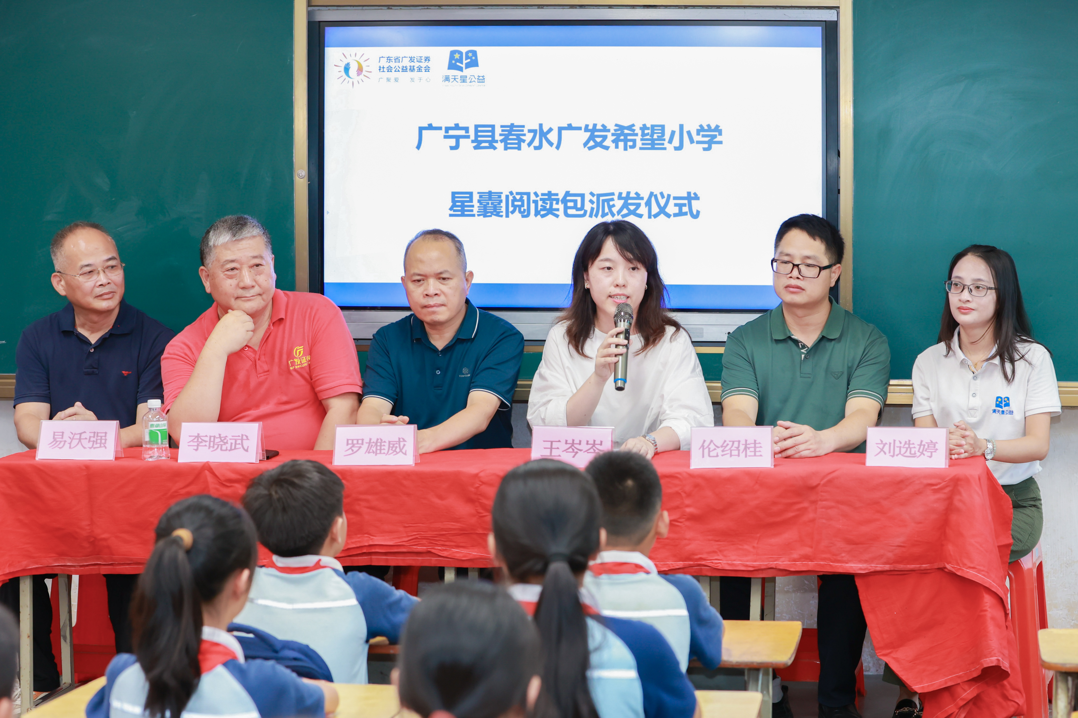 广发证券党群工作部总监王岑岑回顾了广发证券与春水广发希望小学的不解之缘:1998年,广发证券捐建了4层16室的教学大楼;2023年,在省“百千万”纵向帮扶中,广发证券再次与广宁结缘。王岑岑表示,此次在春水广发希望小学开展的星囊派发活动,是对公益初心的传承。广发证券积极履行社会责任,期待星囊的到来,能帮助孩子们看到更广阔的世界,为乡村教育注入更多温暖的希望。