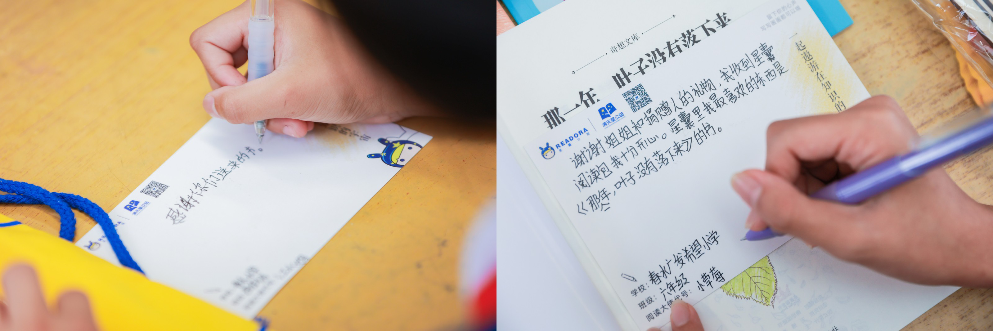 派发结束后,广发证券的志愿者们到达各自负责的班级,为学生们开展星囊认知课。通过生动有趣的视频和互动讲解,引导孩子们探索星囊内的丰富内容——精选图书、阅读宝藏、回音卡及阅读存折。孩子们兴奋地打开阅读包,认识新书,并认真写下人生中第一张回音卡,用稚嫩的笔触表达对书籍的好奇与对爱心人士的感谢。
