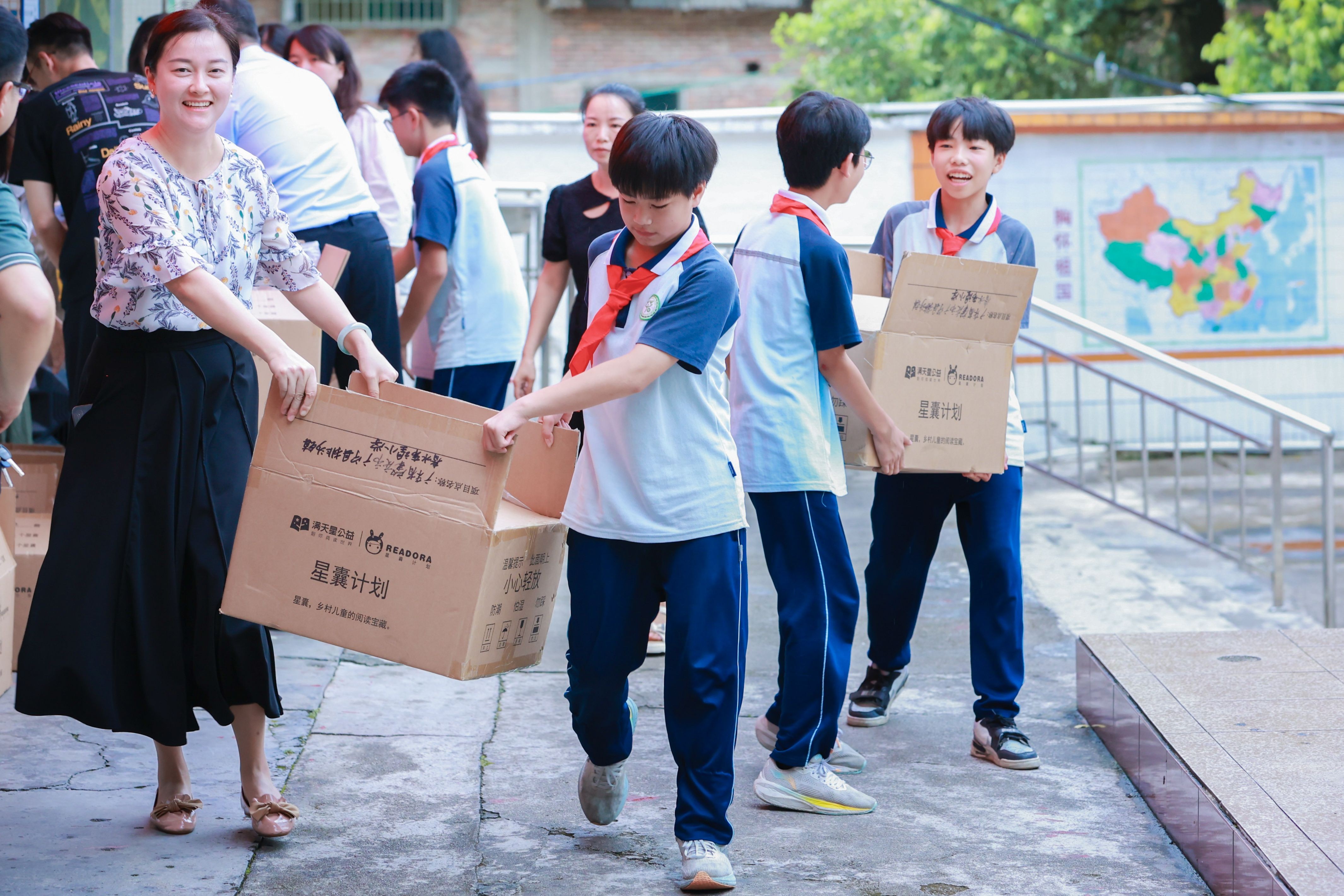 随后,嘉宾、广发证券志愿者及老师们为学生派发星囊。学生们接过星囊后,就迫不及待地翻看着阅读包里的书籍,脸上洋溢着笑容。