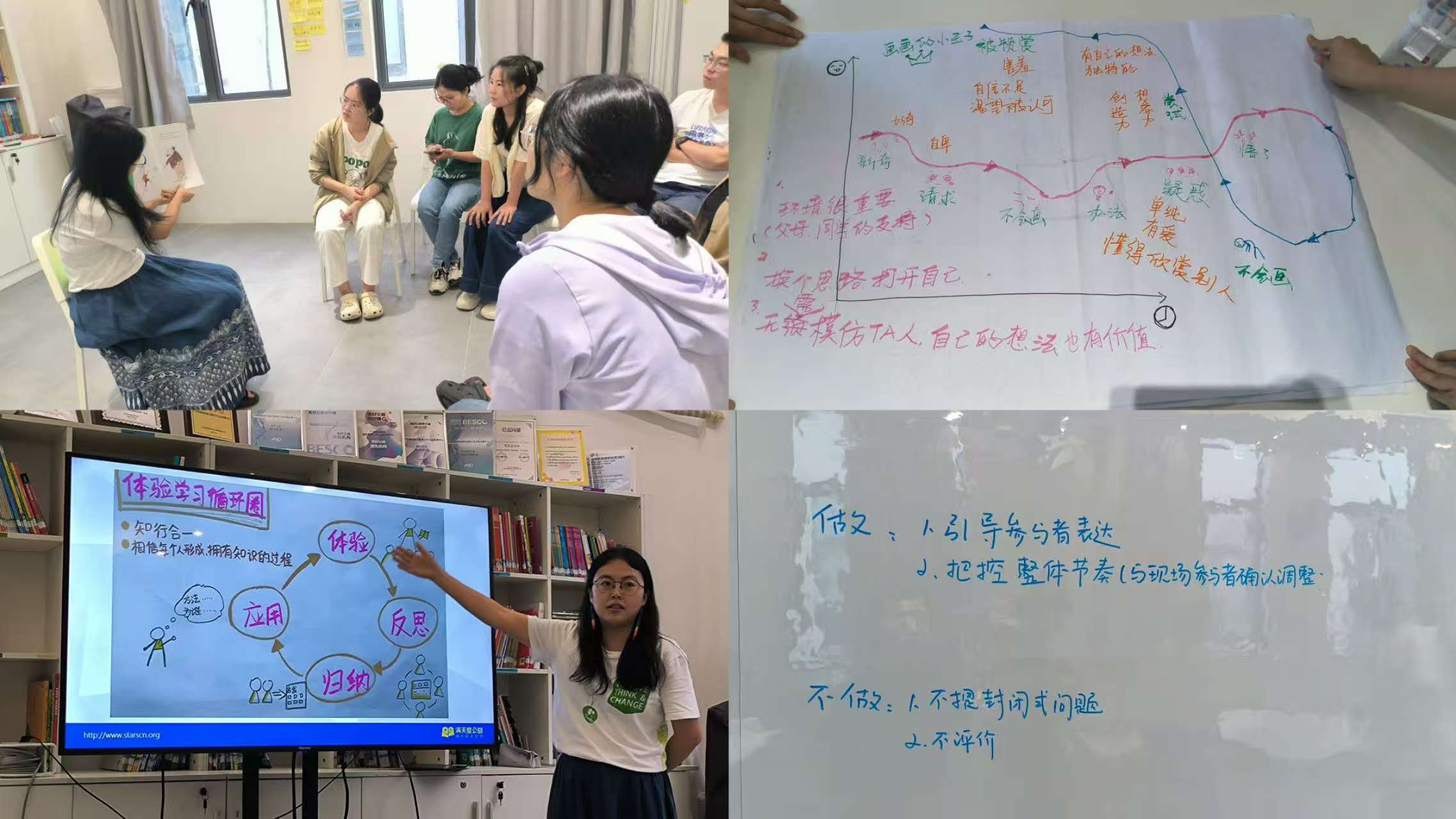 在创新引入八段锦帮助学员调整身心状态的热身环节之后,第二课学习之旅由此开启。刘燕讲师以《给我画一个小王子》为案例,示范“心情坐标图”分析法解读文本情感逻辑。结合“体验学习循环圈”理论框架,系统拆解阅读活动设计要素,使伙伴们重点练习“提问技巧”“互动节奏”“情感共鸣”等核心能力。课后布置的ORID提问练习与实践任务,进一步强化了学员们的教学设计能力。