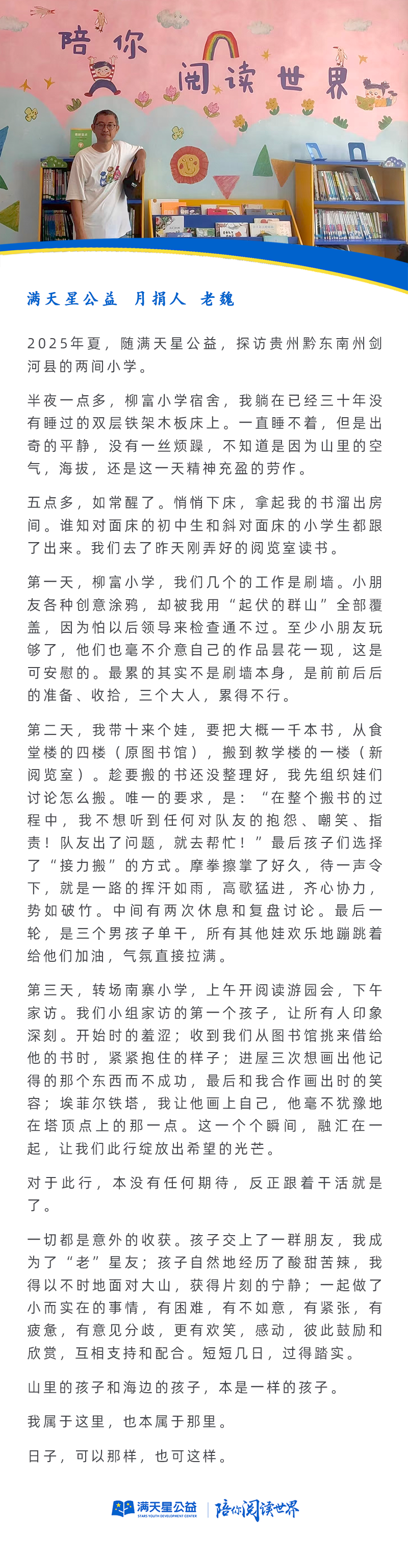 7月23日至25日,满天星公益捐赠人一行前往贵州省黔东南苗族侗族自治州剑河县柳富小学,进行图书馆翻新志愿活动,在星友们两天的共同努力下,图书馆焕然一新。7月25日至27日,星友们来到南寨小学与柳富小学开展探访活动,在学校图书馆里开展绘本故事会、阅读游园会等活动,与孩子们交流阅读,感受项目地的真实生活。