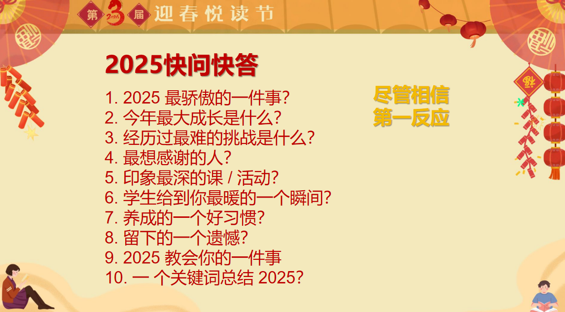 我们以十个快问快答让老师们在轻松的氛围中回顾过去一年的收获,在骄傲、成长、遗憾与温暖中看见彼此。老师们踊跃分享专属于自己的2025 独家记忆:有人为带领六年的学生圆满毕业而满心欢喜,有人以平和心态巧妙化解课堂小插曲,有人在家校沟通中解锁直抓重点的新技巧,更有人坚持为孩子朗读 122 本绘本,在细碎的日常里种下阅读的种子。那些来自学生的暖心小美好、课堂上的高光瞬间以及突破自我的成长时刻,都在字里行间,在每一段坦诚的诉说中闪闪发亮。