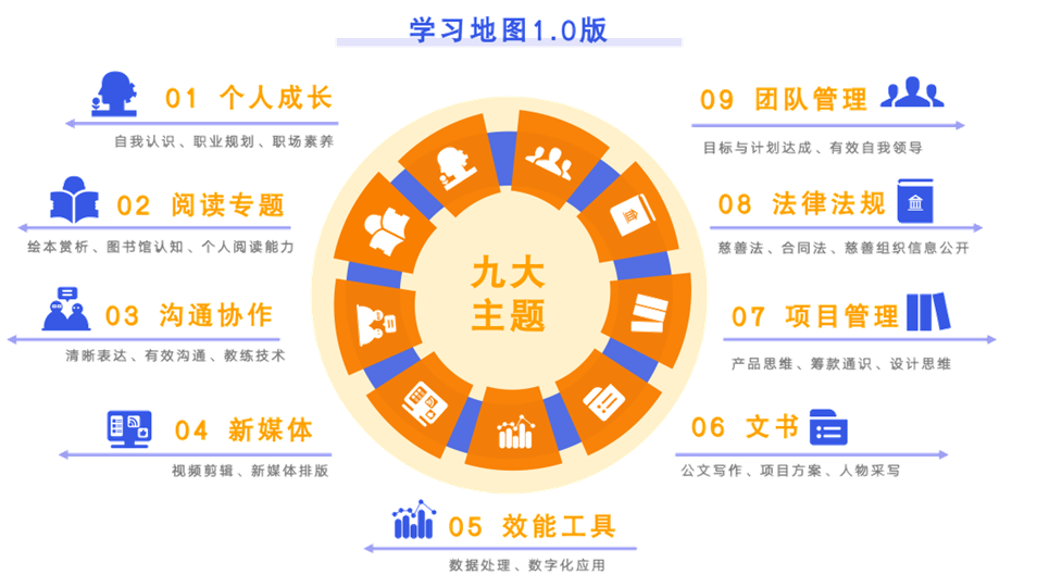 阅读行业人才共学课程以学习地图1.0版为基础,逐步推出相应主题课程、学习资源、阅读书单等,主题包括不限于: